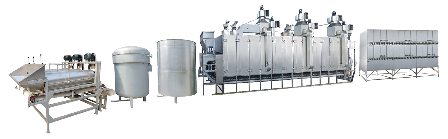 該生產(chǎn)線主要用于加工蒜香、五香、奶香等口味的花生果。是集花生果清洗、蒸煮、入味、烘烤脫水、烘烤干燥及揀選包裝為一體的自動化生產(chǎn)線。