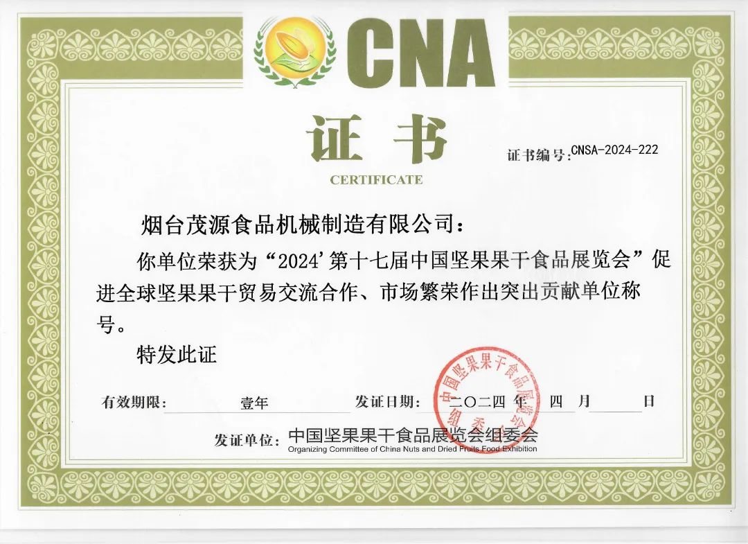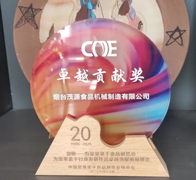 2025 年 4 月 16 日至 20 日,第十八屆堅(jiān)果果干食品展覽會(huì)暨采供大會(huì)盛大啟幕。這場(chǎng)匯聚行業(yè)領(lǐng)袖、專(zhuān)家學(xué)者與企業(yè)精英的年度盛會(huì),成為堅(jiān)果果干產(chǎn)業(yè)發(fā)展的重要交流平臺(tái)。展會(huì)期間,憑借在堅(jiān)果加工設(shè)備領(lǐng)域深耕多年積累的突出成果,茂源脫穎而出 —— 經(jīng)中國(guó)堅(jiān)果果干食品展覽組委會(huì)嚴(yán)格評(píng)審,因其對(duì)展會(huì)舉辦及行業(yè)發(fā)展作出的持續(xù)貢獻(xiàn),被授予 "卓越貢獻(xiàn)獎(jiǎng)",榮膺 "為堅(jiān)果果干食品展覽會(huì)、為堅(jiān)果果干行業(yè)發(fā)展作出卓越貢獻(xiàn)的勤耕者" 稱(chēng)號(hào)。這一重磅表彰,既是對(duì)公司長(zhǎng)期以來(lái)推動(dòng)堅(jiān)果設(shè)備產(chǎn)業(yè)標(biāo)準(zhǔn)化、技術(shù)創(chuàng)新、市場(chǎng)拓展等工作的高度認(rèn)可,也標(biāo)志著行業(yè)對(duì)公司引領(lǐng)作用的深度信賴(lài),更將激勵(lì)我司在未來(lái)持續(xù)賦能產(chǎn)業(yè)高質(zhì)量發(fā)展。
