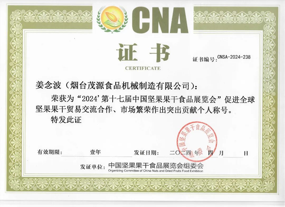 同時(shí),姜念波同志被中國(guó)堅(jiān)果果干食品展覽會(huì)組委會(huì)授予 "杰出貢獻(xiàn)獎(jiǎng)"。這份榮譽(yù)不僅是對(duì)他個(gè)人專(zhuān)業(yè)能力與奉獻(xiàn)精神的高度肯定,更是對(duì)其帶領(lǐng)企業(yè)推動(dòng)行業(yè)進(jìn)步的認(rèn)可。面對(duì)這份殊榮,姜念波同志表示:"這不僅是個(gè)人的榮譽(yù),更是團(tuán)隊(duì)共同努力的成果。未來(lái),將繼續(xù)以推動(dòng)堅(jiān)果加工產(chǎn)業(yè)智能化發(fā)展為己任,與茂源機(jī)械全體同仁攜手,為行業(yè)發(fā)展貢獻(xiàn)更多力量。"茂源機(jī)械將以更高標(biāo)準(zhǔn)、更嚴(yán)要求,向著堅(jiān)果設(shè)備制造領(lǐng)域的新高峰邁進(jìn)。